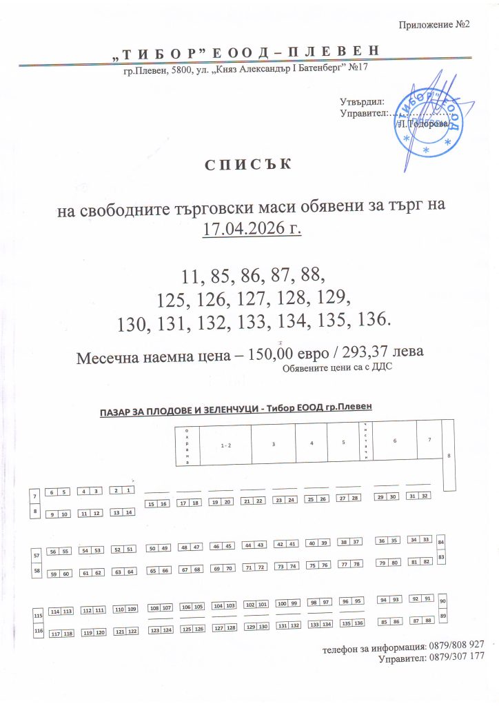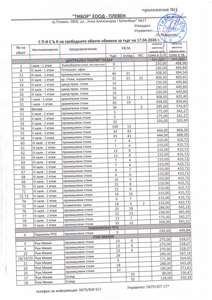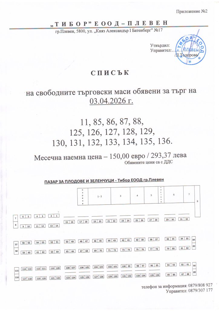 Всеки петък, от 10:00 часа в заседателната зала в администрацията на „Тибор“ ЕООД се провеждат търгове с тайно наддаване за отдаване под наем на търговски обекти в сградите, собственост на дружеството, и на търговски маси в Пазара за плодове и зеленчуци.